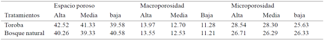 In Zamurito no changes (p< 0.05) for the variable porosity, macroporosity and microporosity when comparing the toroba with the natural forest (Table 4) were observed, no changes were observed along transect. However the trend shown is that the toroba device tends to improve soil physical conditions with respect to initial conditions, however implementation time is not enough for these changes are significant.