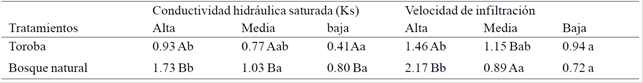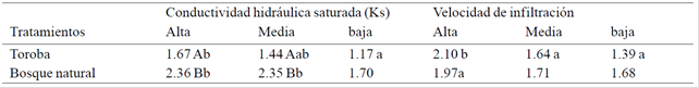 In Zamurito the infiltration rate was higher in the toroba compared to natural forest in the middle position, while in the highest position the highest values corresponded to the natural forest (Table 6) to the down position no significant differences (p< 0.05).