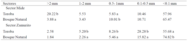 Aggregate stability. The content of aggregates with smaller diameter of 0.25 mm was found in the Zamurito sector (Table 7) due to the disintegration of larger aggregates, which could represent a potential increased risk of erosion since, according to Ramirez et al. (2006), the prevalence of aggregates with sizes of 0.05 to 0.25 mm reflects that soils are most susceptible to water erosion. An important aspect to is that in both cases the device toroba improved soil aggregation, and therefore reduced the risk of erosion, when an increase of aggregates larger than 2 mm.