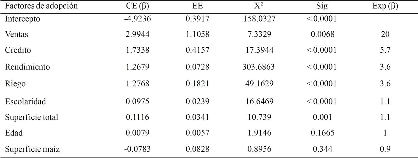 The above results show that in the case of Oaxaca itself is undergoing a process of full adoption, because farmers using improved seeds, also perform the recommended innovations of technology package for corn. Alene and Hassan (2005) found that although farmers used improved seeds, most were partial adopters who did not adopt the crop management practices recommended to fully exploit the potential of improved corn yield. The adoption of the entire technology package is important because it is more profitable than the adoption of a component or components of the package.