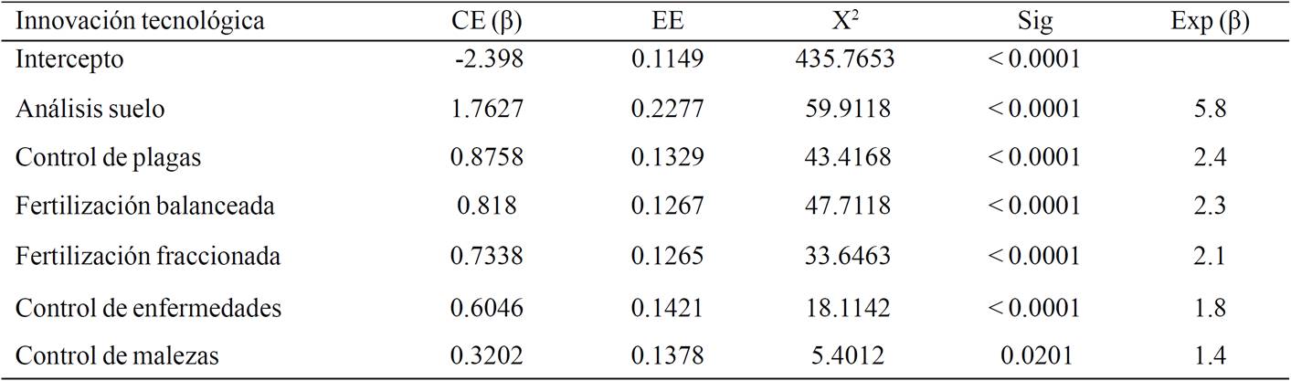 With the information obtained was built a database composed of quantitative and qualitative variables including among others, characteristics of the farmer and his production unit, practiced agricultural innovations, yields, access to resources in general and aspects of perceived risk. From it Logit models whose parameters were estimated with the maximum likelihood method (Agresti, 2007), using the statistical package SAS 9.0 were built. These models are most often used to identify variables that influence the farmer's decision to adopt agricultural innovations (CIMMYT, 1993).