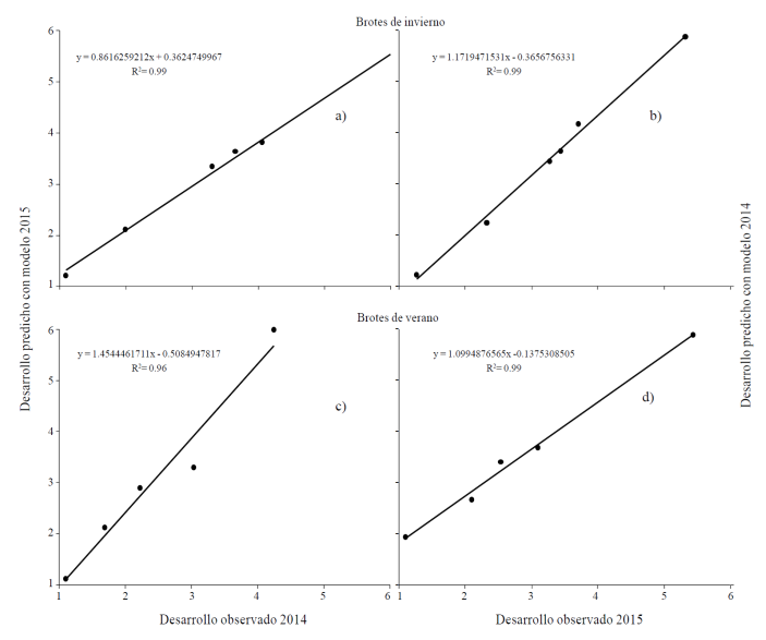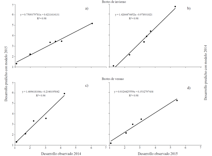 For the outbreaks of each vegetative flow the ability to predict the DIF of the best prediction models obtained in year 1 against the same vegetative flow in year was evaluated, and vice versa. The predicted floral development values were analyzed by a regression against the observed values of the floral development of the year and corresponding vegetative flow using the program Excel (2010). The criteria for determining whether the two-year values belonged to a single population were: 1) that the ordinate at the origin of the regression was closest to one (B0= 1); 2), that the slope is the closest to one (B1= 1); and 3) the highest value of the adjusted model coefficient (R2). This procedure served to debug models and find the best.