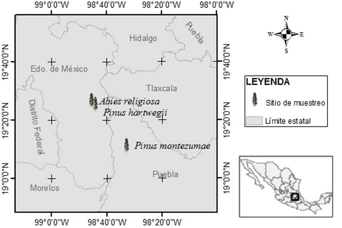 Study area. The study area is located in the eastern part of the Mexican Transversal Volcanic Axis (Figure 1). Two types of forest were selected in a protected natural area (Pinus montezumae Lamb. and Pinus hartwegii Lindl.) And a forest mass in a forest under management (Abies religiosa (H. B. K.) Schl. et Cham.)), Which are located between the following coordinates: 19° 00’ and 19° 28’ north latitude and 98° 35’ and 98° 46’ west longitude (Datum WGS 84).