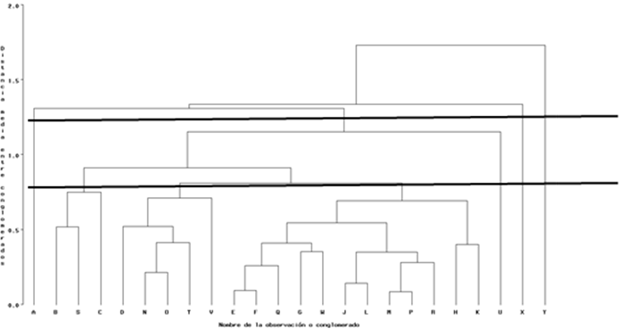 In Figure 1, at the beginning of the output of the result was obtained the history of the agglomerate of producers with tractors and agricultural machines surveyed in which the behavior of the different rates of mechanization in that municipality was determined. On the X axis the different communities were placed and on the Y axis the different average distances between conglomerates. Placing in the dendrogram a first horizontal line to the X axis and above the 1.2 value approximately on the Y axis; we obtain a first criterion in which five agglomerates appear, placing a second line below the first and at a height of approximately 0.8 of distance between agglomerates, we can distinguish seven groups of communities according to the chosen height and that this second one was drawn line. With these two lines, we can distinguish that there are two groups of communities, in the first there are communities that are scattered, such as Animas Atlacomulco (X), Espejel (A); San Pablo Atotonilco (U) and Dolores la Joya (Y), which show different positions of tractors and agricultural machines and as a reference can be referred to Table 2. As a second criterion, we must refer to the bottom line where you can clearly see seven agglomerates of communities, taking into account the indexes analyzed above. Finally, it can be stated that the groups not mentioned above have very similar characteristics or indices in the aspects of agricultural mechanization and their indices in each of their communities surveyed.