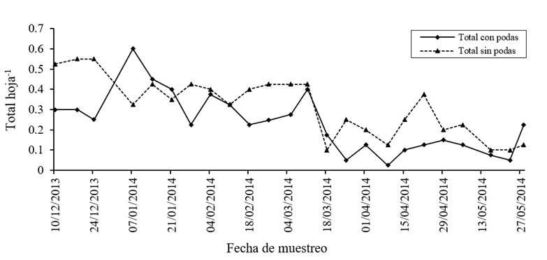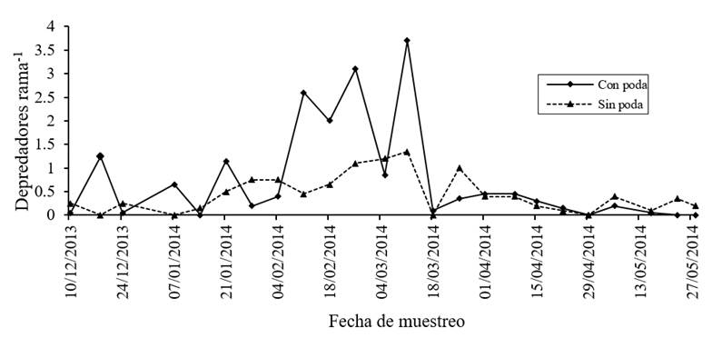 Figure 2 Average number of natural enemies of EBM per branch of mango trees with and without phytosanitary pruning. La Norteña Experimental Site, Tapachula, Chiapas from December 2013 to May 2014.