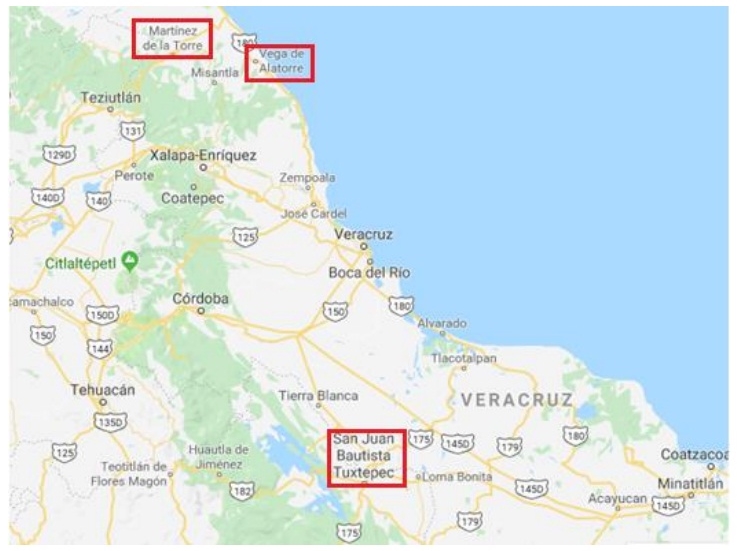 The investigation was carried out during the months of March and April of 2017 in the Central region of the state of Veracruz, in the municipalities of Martinez de la Torre and Vega de Alatorre and in the town of San Jose Chiltepec, belonging to the municipality of Tuxtepec, Oaxaca (Figure 2) where litchi production has recently increased.