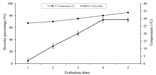 The average severity percentage (PS) recorded; through, the evaluation dates fluctuated between 5.14 and 73.28. It was determined that, from evaluation 5, the average PS remained stable, while the temperature registered an increasing trend, which was related to the severity of the SLCV (Figure 4).
