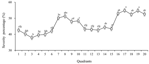 The relationship between the severity and the temperature observed in this work coincides with that reported by Ali et al. (2014) who reported that temperatures between 37.16 and 37.78 °C led to the development of the disease; however, the minimum average temperature of 27.43 °C was favorable for the incidence of geminivirus in cotton and showed significant effect during two consecutive cycles of culture. The combined analysis, through the evaluation dates, indicated that quadrants 7 to 10 and 16 to 20 had a higher PS (47.88 to 54.87%).