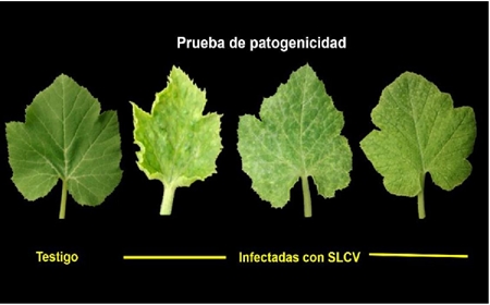 The SLCV transmission test, by whitefly (B. tabaci), was performed on pumpkin (C. pepo) var. Gray Zucchini during the period February-March 2015. This was carried out in cages made with two expanded polystyrene glasses of 1 L capacity, with windows covered with organza fabric.