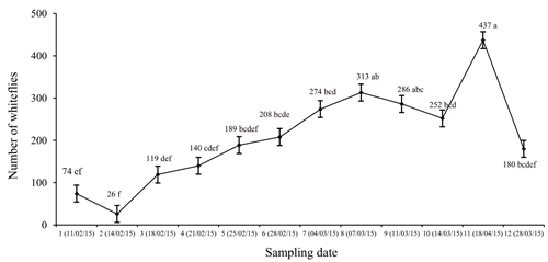 The highest accumulated amount of B. tabaci was obtained on the East side, with 538 individuals, the lowest value was 443 and was found on the South site (Table 1). On the other hand, there were significant differences between the sampling dates (Figure 3), since the populations varied in a range of 26 (date 2) to 437 insects (date 11). Pest management programs should be based on accurate knowledge of the main factors responsible for changes in the dynamics of the target insect population.