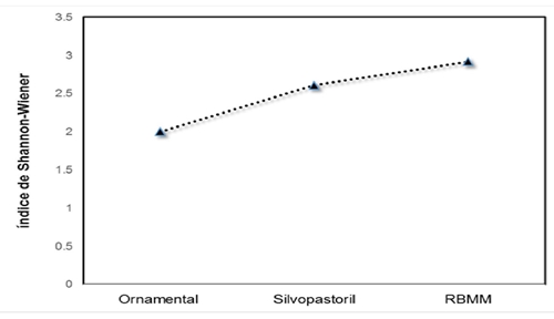 The results of Shannon-Wiener for the data of the different conditions under study suggest that the one with the greatest diversity was: the RBMM (H’= 2.92), followed by the silvopastoral system (H’= 2.61) and finally the ornamental system (H’= 2) (Figure 5).
