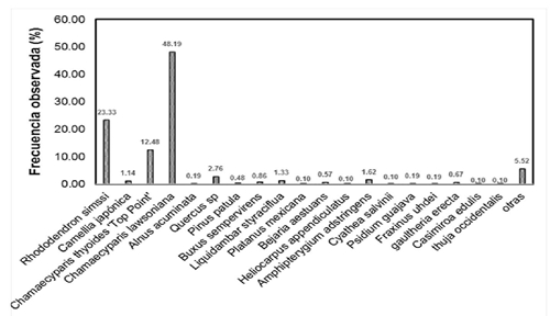 A total of 1050 individuals were registered, the most representative species are Chamaecyparis lawsoniana with 48.19% (506 individuals), Rhododendron simssi with 23.33% (245) and Chamaecyparis thyoides with 12.48% (131), some natives are below 3% (Figure 1).
