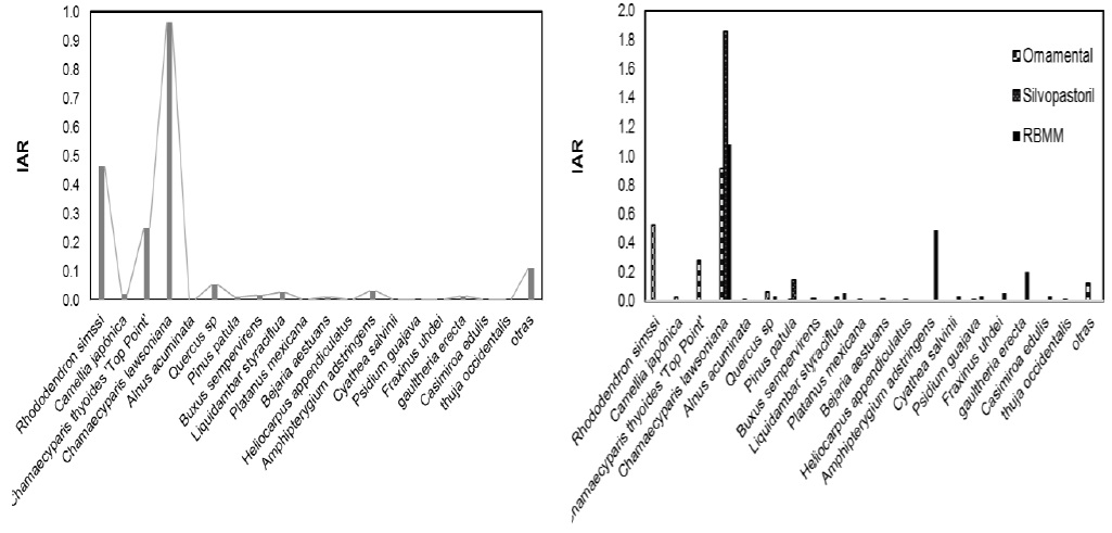The results of the IAR for the frequency data recorded by species in all sites by condition, suggest that the species of greater relative abundance were: Chamaecyparis. lawsoniana (IAR= 0.96), Rhododendron simssi (IAR= 0.46), Chamaecyparis. thyoides (0.25), the values of the rest of the species show lower values (Figure 4a). By condition Chamaecyparis lawsoniana presented greater abundance (IAR= 0.96) in the ornamental system, (IAR= 1.86) for silvopastoral and (IAR= 1.09) for RBMM, the value of the rest of the species exhibited a differential trend in each condition (Figure 4b).