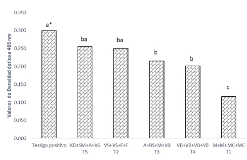 In the analysis of variance significant differences were obtained between the treatments in the viral concentration of TMV, the Tukey means group showed for treatment 1 with the sequence of Messenger gold® (ia protein harpin aß) + Messenger gold® + MC Cream® + MC Cream® the lowest concentration of TMV (0.11 OD units) which was statistically different from the other treatments 5, 2, 3, 4 and positive control (Figure 1). Chuang et al., 2014 mentioned the harpin protein in improving resistance to plant diseases.