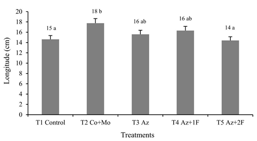 Figure 1 shows the data regarding the length of roots, the same sample as in treatment 2, corresponding to the group of seeds treated with cobalt plus molybdenum (Co + Mo), presented a significant difference compared to control and treatment 5 which make up inoculated seeds plus two foliar applications (Az + 2F) but not with treatments 3, consisting of inoculated seeds (Az) or with treatment 4, inoculated seeds plus a foliar application (Az + 1F).