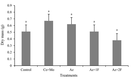 In the same way as the dry mass of roots, the weighing of the aerial parts of leaves of rice plants did not show significant differences between treatments (Figure 3), the ranges being 4.28 g for treatment 3 (Az) and 4 g observed in treatment 2 (Co + Mo).