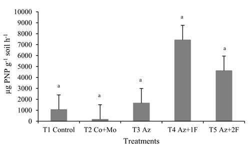 Figure 4 Enzymatic activity phosphatase of soil samples used for rice cultivation in the different treatments with A. brasilense and chemically treated. T1= control (absolute control), seeds without any treatment; T2= Co + Mo, seeds treated with cobalt plus molybdenum; T3= Az, seeds inoculated with A. brasilense; T4= Az + 1F= seeds inoculated with A. brasilense plus a foliar application; T5= Az + 2F= seeds inoculated with A. brasilense plus two foliar applications.