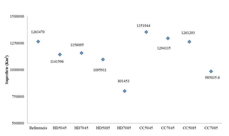 In climate change climatologies, the HADGEM-ES model in the two RCPs indicates a decrease in the potential distribution surface of P. lunatus mainly in the Yucatan Peninsula and Central America (Figures 4B, 4C, 4D and 4E) that goes from -8 to -10% in RCP4.5 at a range of -13 to -37% (Figure 5) in RCP8.5. These effects on the Yucatan Peninsula are particularly important, since this area represents one of the most important centers of diversity of the Lima bean MII genetic group.