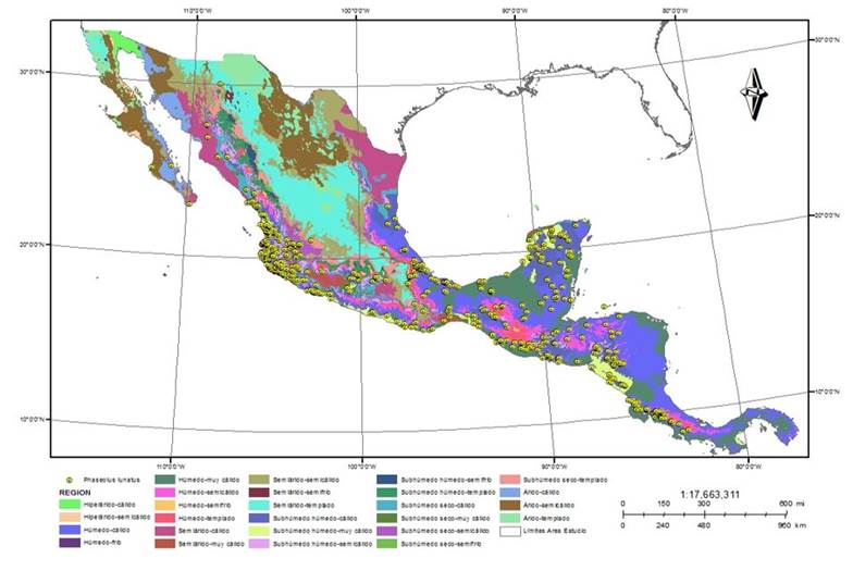 Figure 2 Agroclimatic regions and distribution of Phaseolus lunatus.