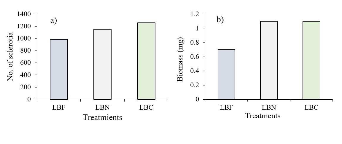 Figure 2 Influence of light quality, emitted by fluorescent lamps with cold white (LBF), neutral (LBN) and warm (LBC) light, on the formation of sclerotia (a) and mycelium biomass (b) from Sclerotium rolfsii grown in vitro.