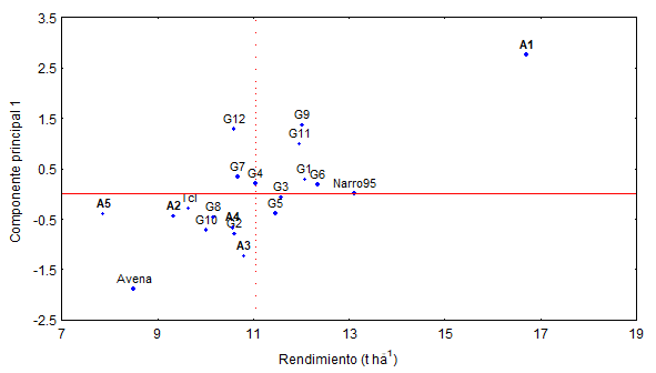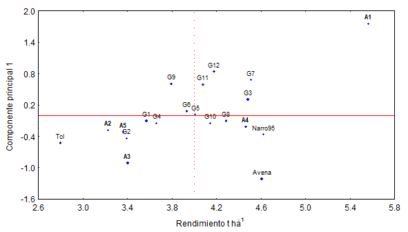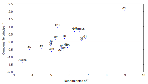 By graphing genotypes and environments in the plane generated by the yield of total dry forage and the first component of AMMI (Figure 2), genotypes can be rated: barley Narro95 and wheats G6 (AN-263-99), GI (AN-228-09), G11 (AN-326-09) and G9 (AN-268-99) as desirable genotypes, as they showed the highest yields with respect to the overall mean (dotted line) and small and positive interactions (distance from the solid line). The genotypes AN-244-99 (G3) and AN-229-09 (G5) also exceeded the overall mean but exhibited small and negative interactions. Oats were the least yielding of genotypes and showed large and negative interactions.