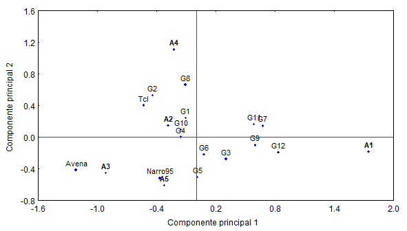 Genotype 3 (AN-244-99) had small negative interactions with both components. The greatest positive interactions (with both CP) were presented by wheat genotype 9 (AN-268-99), so that due to their positive interactions it can produce a little more than the expressed mean, something similar happened with genotypes G6 and G12 (AN-263-99 and AN-264-99), while oats cv Cuauhtémoc had negative interactions with the first component and positive interactions with the second CP, so lower production than that expressed as average is expected (Figure 1).