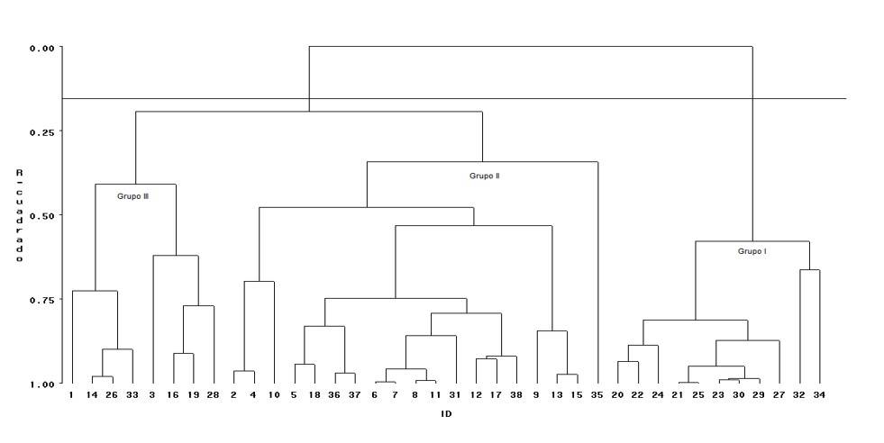 Figure 1 Dendrogram of 10 dimensions for the 38 bean farmers members of PRODETER ‘Sombrerete II’ in Zacatecas.