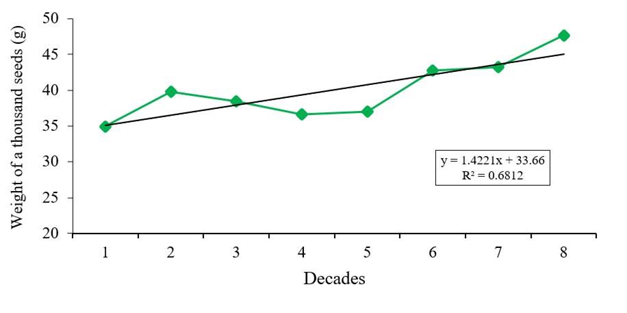 Table 4 shows the analysis of variance to compare the physical quality of the seed between the eight decades of genetic improvement, for WTS, highly significant differences were obtained for decades and years, while for their interaction, significant differences were only obtained in WTS, with an overall mean of 40.06 g. In the variable VOLW, there were highly significant differences for decades and years, but not for their interaction, reaching an average of 80.35 kg hl-1. On the other hand, for PM, there are highly significant differences between decades, years and their interaction, with an overall mean of 8.23%.