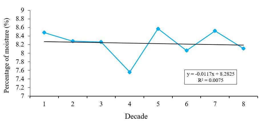 Figure 6 shows that, over the decades, PM values have shown irregular behavior, with values below the requirements of the seed industry, in this variable no effect of genetic improvement was observed.