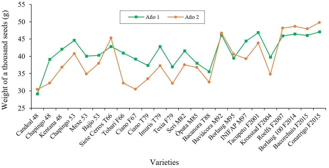 Figure 1 shows the average behavior of the interaction variety × year for the variable WTS, it is observed that the same variety can have contrasting values, such is the case of Siete Cerros T66, Borlaug M95, Roelfs F2007, Borlaug 100 F2014, Bacorehuis F2015 and Conatrigo F2015, which increased their weight compared to the first production cycle; this variation between cycles is attributed to the effects of the interaction genotype × environment. These results are consistent with what was reported by Paquini et al. (2016), who mention that, for the same locality and production system (normal irrigation), there can be differences of up to 30% in yield under favorable conditions with respect to limited irrigation.