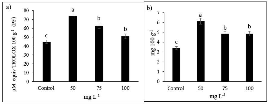 Figure 1 Effect of Fe2O3 NPs on the content of phenolic compounds (a), flavonoids (b), in cucumber fruits. Columns with different letters differ statistically from each other (Tukey p≤ 0.05).