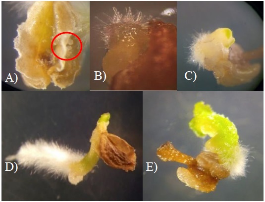 Figure 1 Germination of embryos and development of haploid plants during the culture of anthers of genotype 3328 of ancho chili. A) proembryos in the pollen duct of the anther; B) root bud formation; C) embryo with start of apical bud differentiation; D) embryo independent of the anther; and E) differential stages of embryo germination and seedling elongation.