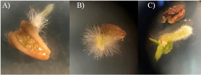 Figure 2 Anthers with evidence of androgenesis and embryo germination. A) root bud of an anther belonging to line 3385 at 28 days in germination medium; B) separation of the lateral edges of the anther of line 3384 at 42 days in germination medium; and C) leaf primordia of line 3344 at 56 days in germination medium.