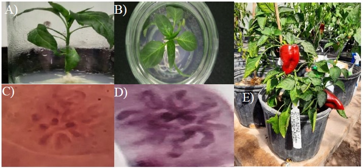 Chromosomal duplication of chili haploid plants (n= 12) is necessary to restore diploid status (2n= 24) and thus fertility. In this work, no spontaneous double haploids were observed, so it was necessary to establish incubation with colchicine for all plants derived from androgenesis and embryogenesis (Figure 3A). The concentration of colchicine used (0.5%) for 8 h of exposure (Figure 3B), coincides with most reports of double haploids in chili, the method of identification of chromosomal content in metaphase stage (Figure 3C), was efficient and chromosomal duplication was verified days later in the acclimatization stage (Figure 3D). Comlekcioglu (2021) reports that the inclusion of colchicine (0.3%), from the induction medium, increases the rate of spontaneous chromosomal duplication from 33% to 57.6%, which is contemplated within the perspectives to incorporate in future trials. The double haploid plants of chili developed a normal size in the greenhouse, regained their fertility and produced fruits (Figure 3E).