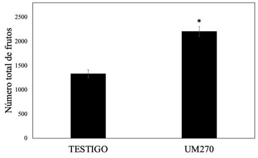Figure 2 Total fruits harvested from plants inoculated with the strain UM270 of Pseudomonas fluorescens and compared with those harvested from control plants without inoculation. The asterisk (*) indicates a statistically significant difference p< 0.05, t-test.
