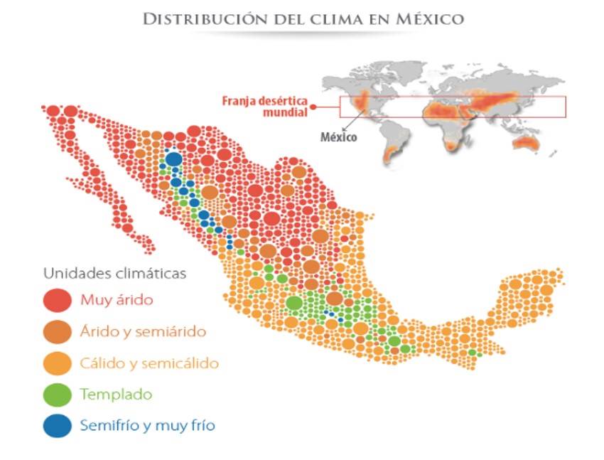 Since arid and semi-arid climates predominate (51.7%) in Mexico, mainly because the north of the country is in the world desert strip -deserts of the Sahara in Africa, Nefud and Rub al-Khali in the Arabian peninsula and Thar in India- (A-BAK’, 2014). Mexico great variety of climates.