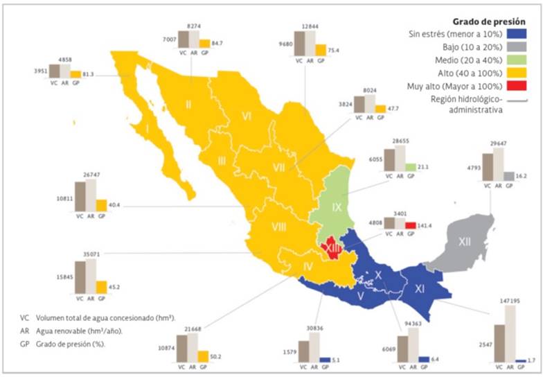 Figure 2 Degrees of pressure on water in the hydrological-administrative regions (HARs) of Mexico (CONAGUA, 2018).