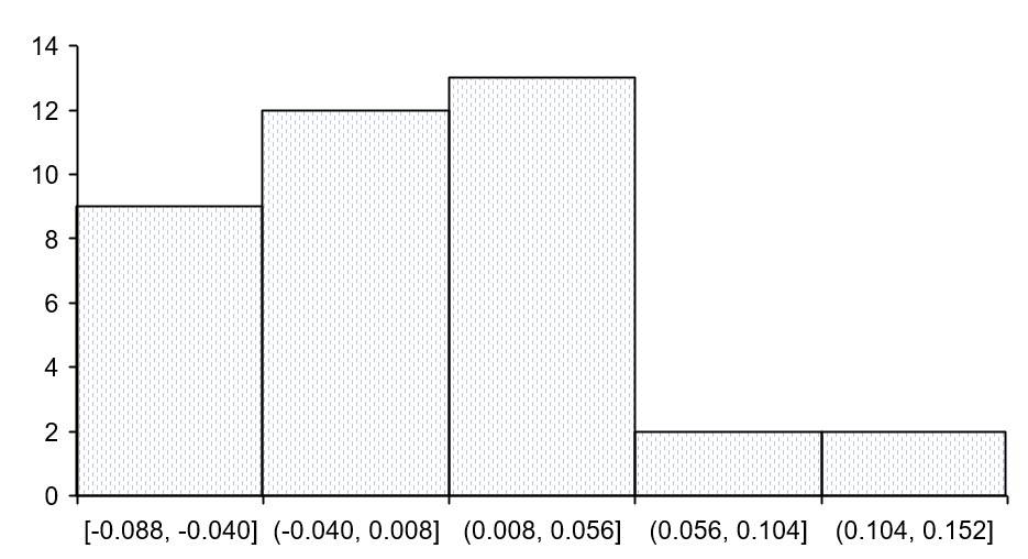 The serial correlation was ‘corrected’ with the method proposed by Huber-White-Hinkley (HC1). The normality test of the residuals of the estimated model was performed based on the Jarque-Bera test (J-B) and a p-value of 0.49 was obtained, with a skewness coefficient of 0.46 and a kurtosis coefficient of 2.75, its histogram (Figure 3).