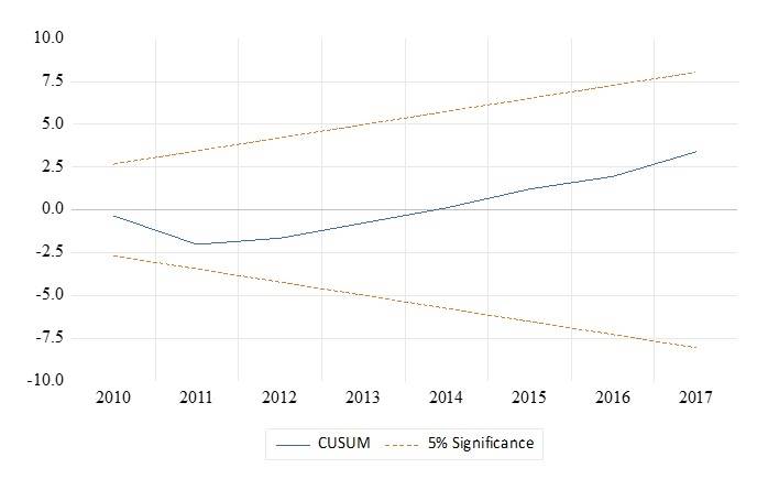 The possible bias of model specification was tested with the augmented White test (with crossed terms), which, with a p-value of 0.53, confirmed the correct specification. On the other hand, the Ramsey regression specification error test -RESET- was applied, which, with a p-value of 0.59, allowed us to rule out this possibility. Parametric stability was checked with the Cusum and Cusum of squares tests, which can be seen in Figures 4 and 5, respectively.