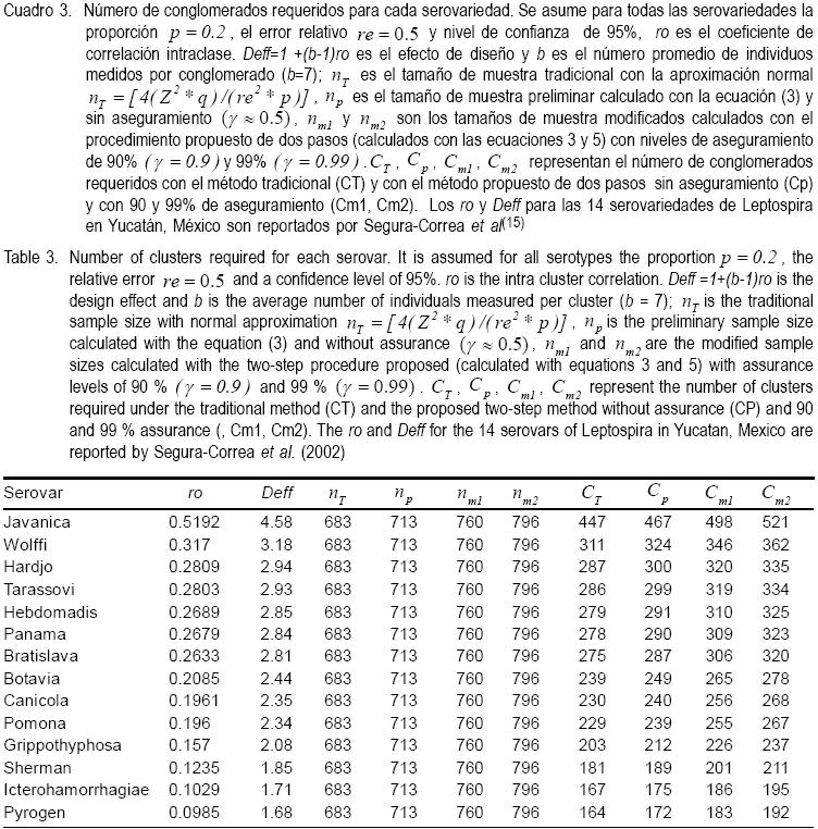 Para afianzar como obtener el número de conglomerados requeridos. En el Cuadro 3 se presentan los coeficientes de correlación intraconglomerados (ro) y efectos de diseño (Deƒƒ) para 14 serovariedades de Leptospira para Yucatán México reportados por Segura–Correa et al(15). Los efectos de diseño se obtienen con la expresión: Deƒƒ=1 + (b–1)ro, asumiendo un valor de b = 7 (número promedio de animales medidos por rancho). En seguida para cada serovariedad se calcula el tamaño de muestra tradicional con la expresión asumiendo p = 0.2, re=0.3 y un IC de 95% (Z=1.96). Posteriormente, con el método propuesto (enfoque AI PE) se calculan para cada serovariedad los tamaños de muestra preliminar (np sin γ,γ=0.5), tamaños de muestra modificados con niveles de aseguramiento de 90 % (γ=0.90) y 99 % (γ=0.99) de igual manera asumiendo una proporción de 0.2, un error relativo de 0.3 y un IC de 95 %. Aquí se puede resaltar nuevamente que el tamaño de muestra tradicional ( nT) es menor que el preliminar y modificado, lo que muestra claramente que la expresión para el cálculo del tamaño de muestra tradicional produce una seria subestimación. Finalmente, para cada uno de estos cuatro tamaños de muestra se reporta el número de conglomerados requeridos de tamaño 7 que se calculan con la expresión , para i=T, p, m1 y m2. También se observa que el número de conglomerados con el enfoque tradicional ( CT) subestima el número de conglomerados requeridos.