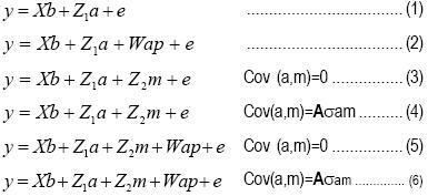 Los componentes de varianza y covarianza fueron calculados por medio de la metodología REML, utilizando el programa ASReml(11). Los modelos fueron ajustados para estimar los parámetros genéticos para cada característica, incluyendo o eliminando distintas combinaciones de efectos genéticos maternos o maternoambientales permanentes, tales como: