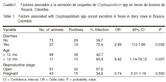 Las variables que en el análisis univariado de Ji2 tuvieron valores con P<0.05 fueron edad, donde se encontró que el 90.9 % de los animales jóvenes (<12 meses) resultaron positivos a Cryptosporidium spp y tuvieron 9.42 veces más probabilidad de excretar ooquistes; y presencia de diarrea donde el 70.4 % de los animales con diarrea presentó excreción de ooquistes de Cryptosporídium spp, mientras que sólo el 39.7 % de los animales no diarreicos presentó excreción de ooquistes.