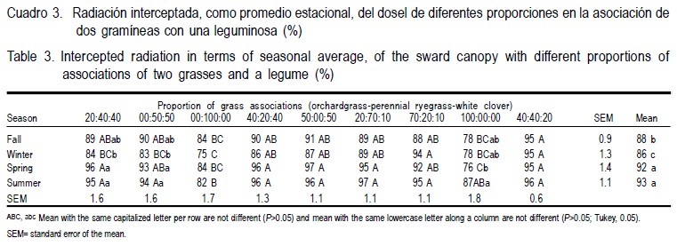 Todas las asociaciones registraron la mayor radiación interceptada en primavera-verano (P<0.05; Cuadro 3) superando a las registradas en otoño e invierno. En general, el porcentaje promedio de radiación solar interceptada fue de 86, 88, 92 y 93 % en invierno, otoño, primavera y verano, respectivamente. La estacionalidad en el porcentaje de radiación interceptada, estuvo directamente asociado (r2=0.6) con la distribución estacional del rendimiento de forraje (Cuadros 1, 4), por lo que a mayor radiación estacional interceptada, mayor rendimiento de forraje, independientemente de la asociación.