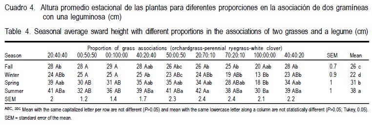 La mayor altura de planta promedio se registró en verano (38 cm), superando en 42, 68 y 19 % a otoño, invierno y primavera, respectivamente (Cuadro 4); durante la época invernal, se presentó la menor altura promedio en todos los tratamientos. En tanto, que la mayor altura (42 cm), la registró la asociación 20:70:10 en verano; y la menor altura en todas las estaciones del año la obtuvo l a asociación 70:20:10 (P<0.05). En general, la altura promedio de las praderas se afectó significativamente por la estación del año. El monocultivo de ballico perenne fue superior al monocultivo de ovillo, en todas las estaciones del año (P<0.05).