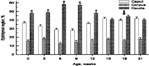 Each time point represents the mean ± SE for 4 to 6 rams. *Cauda was greater than caput from 0 to 12 wk of age (P<0.001); corpus always accounted for the smaller percentage to the total epididymal weight (P<0.001). The arrow indicates the age when sperm first appeared in the tubular lumen of the three epididymal regions.