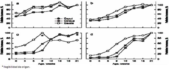 Epididymal epithelium. The interaction age by region was significant (P<0.001) for both variables of the epithelial layer. In the caput and corpus, the epithelium height did not change between birth and wk 6, then increased until wk 12 (caput) or 15 (corpus), with no further changes (Table 3); in the cauda, an increasing trend was observed from birth to wk 9, then, decreased on wk 12, with no more changes until wk 21. Comparison between regions had two different phases, from birth to wk 9, the epithelium was highest in the cauda and lowest in the caput (P<0.05), but from 12 to 21 wk the situation reversed, as the lowest values were observed in the cauda (P<0.05) and the greatest in the caput and corpus with no differences between the last two. Regarding the increasing rate (Figure 3c), at birth, cauda had over 45 % of their maximum value, which was reached at wk 9; caput and corpus, at birth had reached, respectively, 20 and 25 % of the value at wk 21, and did not reach over 90 % until wk 15. The epithelial area (Table 3) did not change between birth and wk 6 (caput and corpus) or 3 (cauda), then, it increased until wk 15 in the three regions (P<0.05), with no further changes (Table 3). Between birth and wk 12, the greatest values were observed in the cauda, with the smallest values in the caput (P<0.05); from wk 15 onwards no differences among regions were detected. The increasing rate was always greater for cauda (Figure 3d), by wk 6 it had reached 31 %, as compared with 5 and 8 % for caput and corpus, respectively; such differences were maintained until wk 18.