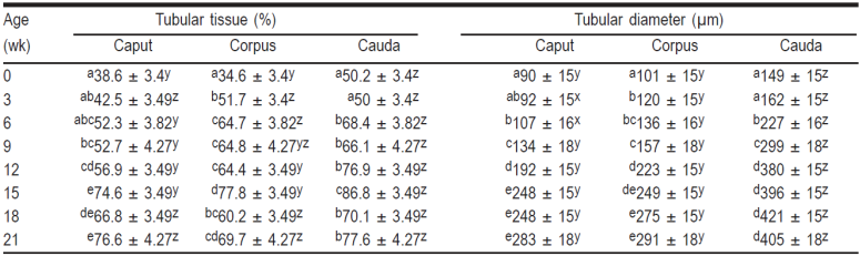 Table 1 Mean (± SE) of the percentage of tubular tissue and the average tubular diameter in the several epididymal anatomical regions in Barbados Blackbelly ram lambs, from birth to 21 wk of age.
