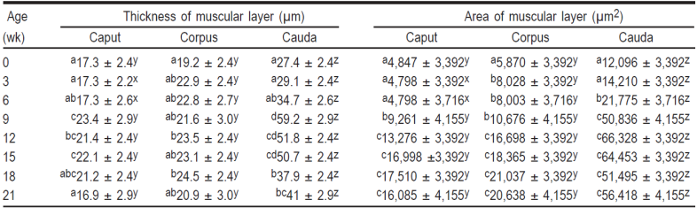 Table 2 Mean (± SE) of the thickness and area of the tubular muscular layer in the several epididymal anatomical regions in Barbados Blackbelly ram lambs, from birth to 21 wk of age.