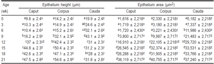 Table 3 Mean (± SE) of the tubular epithelium height and area in the several epididymal anatomical regions in Barbados Blackbelly ram lambs, from birth to 21 wk of age.