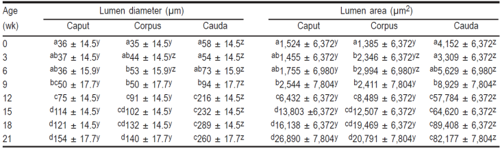 Table 4 Mean (± SE) of the tubular lumen diameter and area in the several epididymal anatomical regions in Barbados Blackbelly ram lambs, from birth to 21 wk of age.